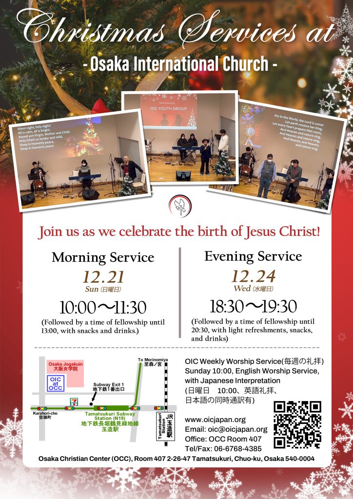 大阪インターナショナル・チャーチ(OIC)は大阪の中心地区で伝道奉仕をしている、国際、超教派、プロテスタント、キリスト教会です。 OICに集う人々は、日本をはじめ、世界のさまざまな国々から来日しているクリスチャンです。礼拝は、日曜日の午前に、英語で行われており、日本語の同時 通訳があります。